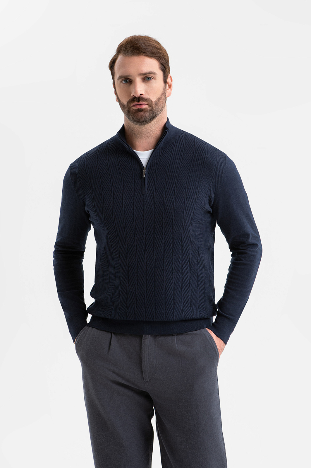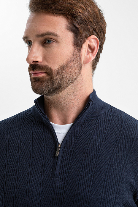 Джемпер KANZLER из хлопка и кашемира с молнией — воплощение комфорта и элегантности. Базовая модель для мужчины, который ценит качество, стиль и премиальные материалы. Переднюю часть украшает выразительный фактурный рисунок, образованный диагональным рубчиком и чёткими вертикальными линиями. Архитектурный дизайн подчеркивает строгость и аккуратность модели, делая её уместной как в деловом, так и в повседневном стиле. Вязаный трикотаж из натуральных волокон приятен к телу, мягко ложится по фигуре и обеспечивает комфорт в течение дня. Кашемир придаёт ткани изысканный вид и нежность, а гипоаллергенный хлопок — прочность, воздухопроницаемость и практичность. Параметры модели: рост 189, 102-80-99 Размер на модели: M