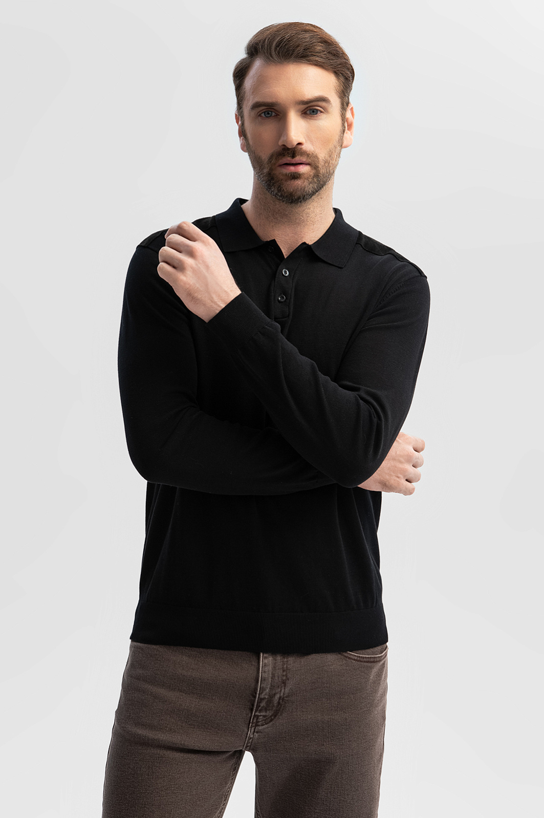 Роскошное черное поло KANZLER с пуговицами и длинным рукавом из хлопка, шелка и льна придает официальному образу стильность и привносит в повседневные аутфиты изысканность и респектабельность. Модель подходит для встреч, деловых поездок и приятного вечернего отдыха в городе. Мягкие широкие резинки на рукавах и снизу обеспечивают безупречную посадку. Практически неосязаемая легкая вещь создана из гладкого трикотажного полотна исключительного качества. В составе премиальной ткани —воздушный дышащий хлопок, легчайший благородный шелк и прочный износоустойчивый лен. На плечах модель декорирована бархатистой алькантарой. Параметры модели: рост 189, 102-80-99 Размер на модели: M