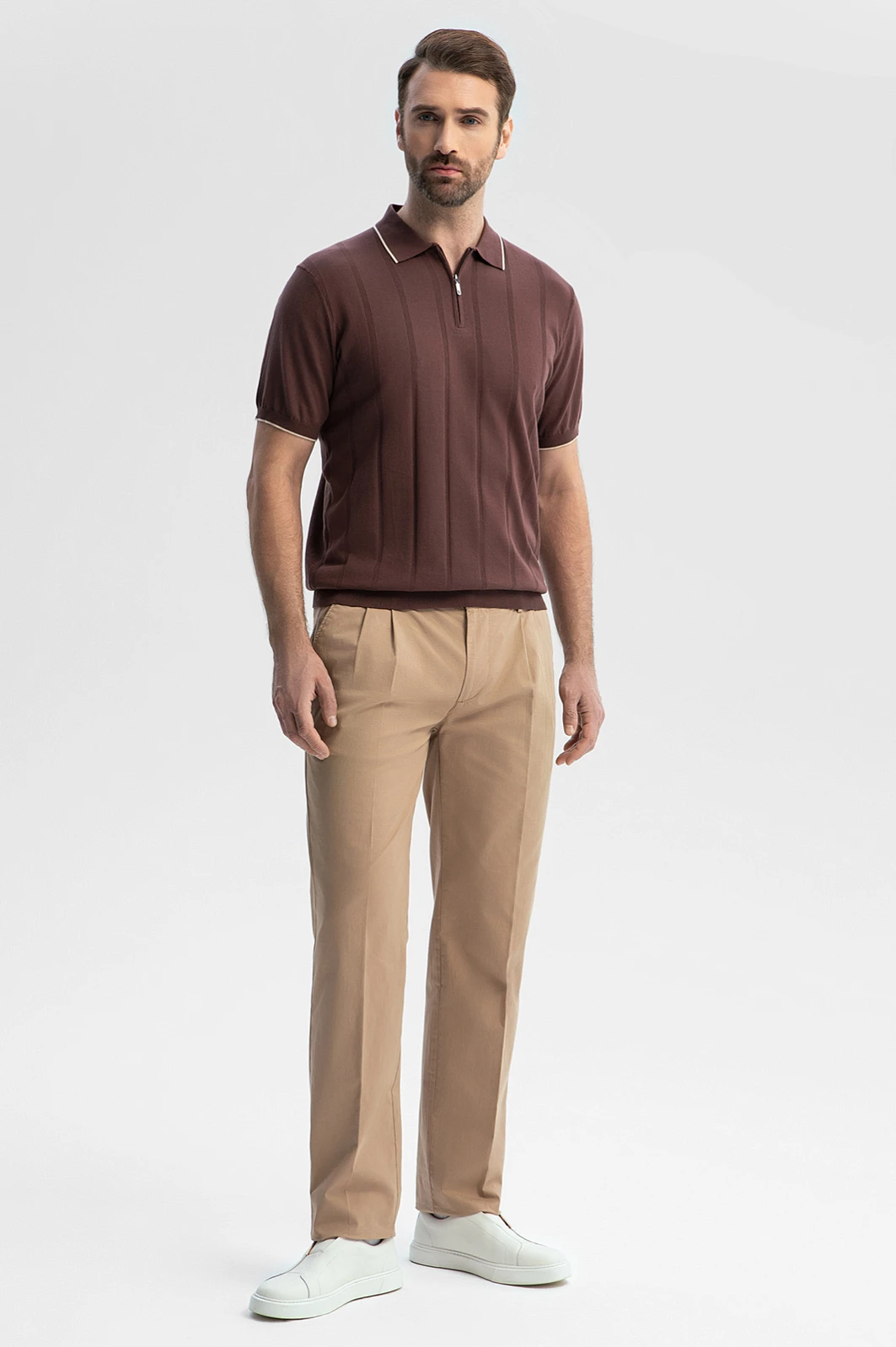 Поло из 100% хлопка Пима в шоколадном оттенке сочетает тенденции современного дизайна и проверенное временем качество. Шелковистый на ощупь хлопок Пима обеспечивает непревзойденное чувство комфорта. Мягкий материал с гладкой фактурой обладает повышенной прочностью и способностью сохранять цвет и форму изделия, чтобы оно оставалось актуальным долгие годы. Воротник с молнией добавляет образу динамичность. Вертикально направленные полосы визуально вытягивают силуэт и придают ему стройность. Рекомендуем сочетать модель с классическими брюками, брюками или бермудами в теплой гамме. Параметры модели: рост 189, 102-80-99 Размер на модели: 50