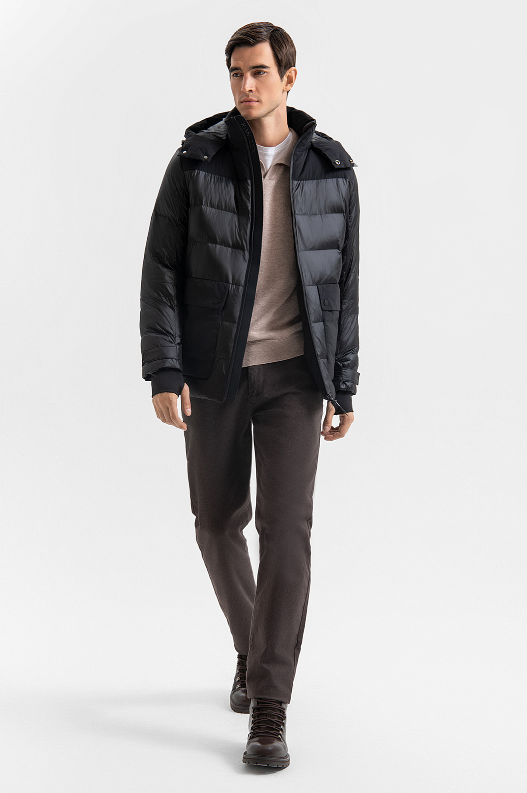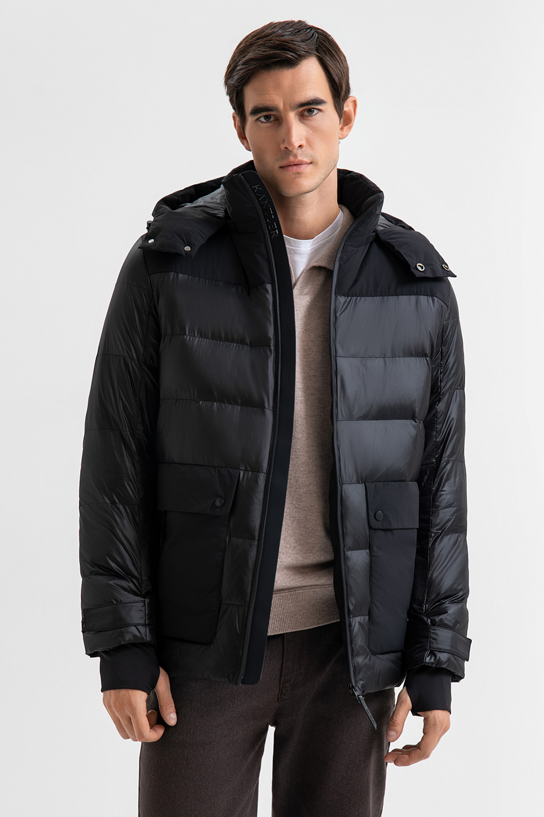 Черная стеганая куртка KANZLER на молнии с капюшоном — функциональная и выразительная вещь, в которой дизайнеры объединили черты спортивной и повседневной одежды, предлагая комфорт и городской вид. Модель подходит для сверхскоростного ритма мегаполиса — сочетает практичность, функциональность и современную эстетику. Основная часть выполнена из гладкого полиамида. Верх передней части и спинки, капюшон и карманы — из прочного полиэстера — матового, сдержанного по виду и тактильно приятного материала. Карманы снабжены клапанами на кнопках и боковыми молниями. У рукавов имеются эластичные спортивные манжеты с отверстиями для больших пальцев, которые фиксируют рукав и защищают от ветра. Премиальный наполнитель не сбивается и быстро восстанавливает объём. Он состоит из 70% полиамида и 30% кашемира, сочетая технологичность и комфорт. Полиамид не утяжеляет куртку и сохраняет комфортную температуру даже при высокой влажности, а кашемир удерживает тепло тела и поддерживает циркуляцию воздуха. Параметры модели: рост 192, 101-76-97 Размер на модели: 50