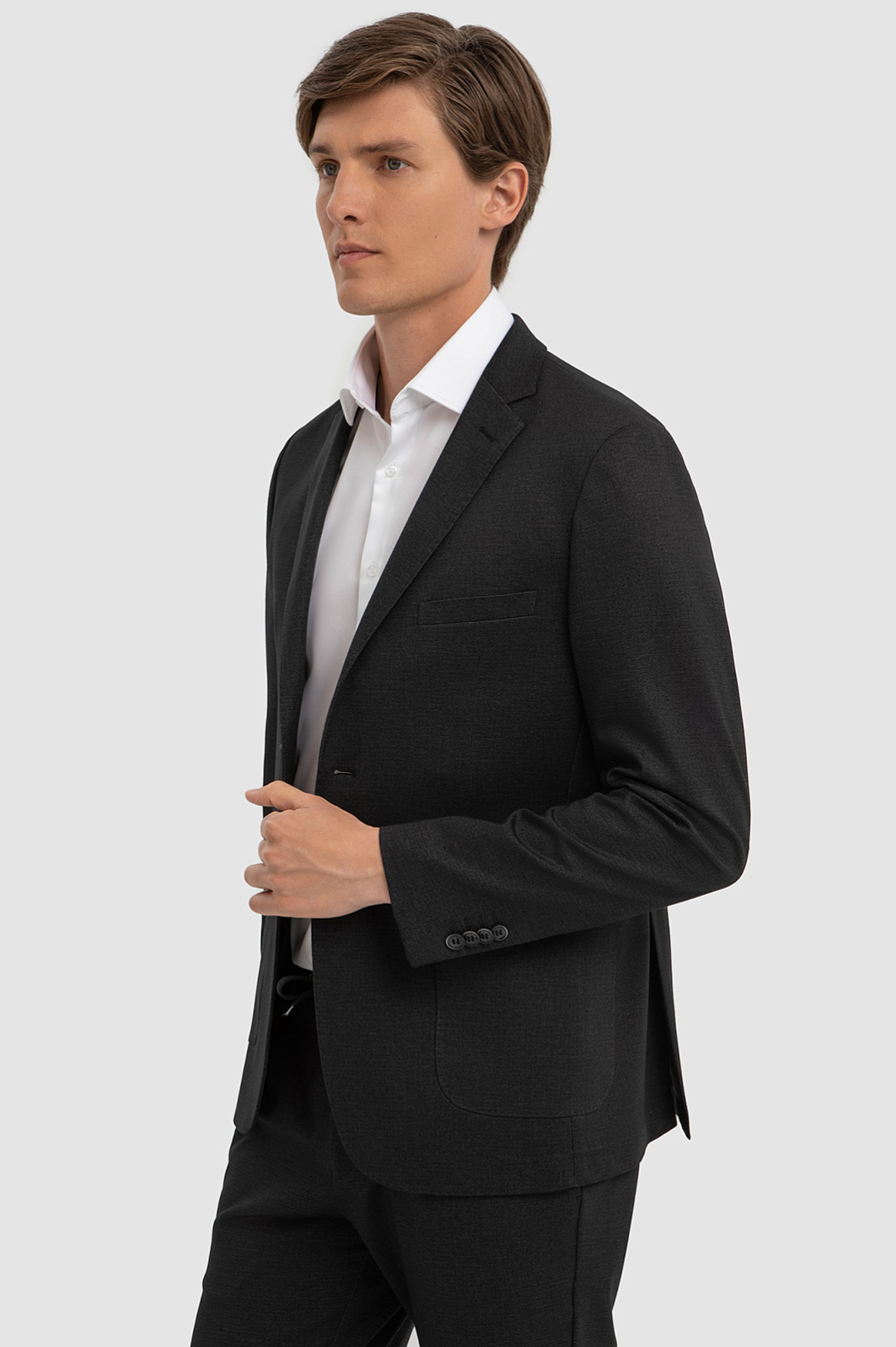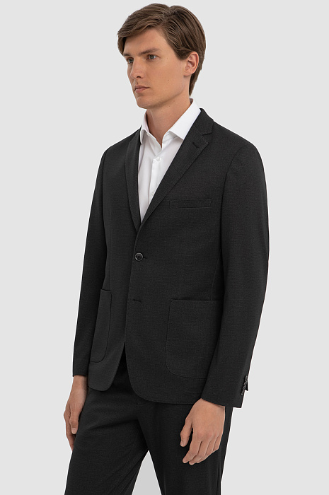 Темно-серый однобортный пиджак KANZLER – классическая и в тоже время расслабленная модель, которая гармонично встроится как в деловой, так и в повседневный образ. Градус строгости понижают плавные скругленные линии накладных карманов и нижнего края. Двойная шлица обеспечивает свободу движения и придает образу динамичность. Приталенный крой садится точно по фигуре и создает аккуратный образ. Модель выполнили из высококачественного смесового материала на основе синтетического волокна, прочного, мягкого района и эластичного спандекса. Благодаря составу пиджак отлично сохраняет форму, пропускает воздух и впитывает влагу. Модель можно дополнить брюками из такого же материала. Параметры модели: рост 191, 97-77-99 Размер на модели: 50