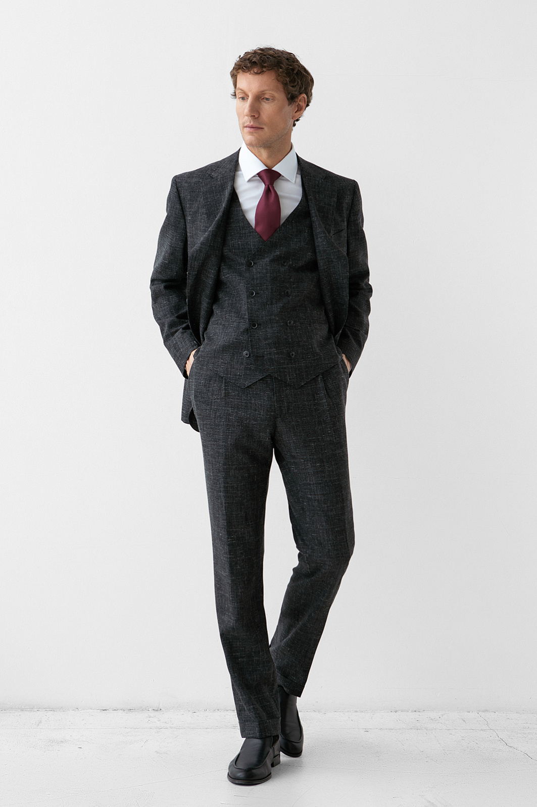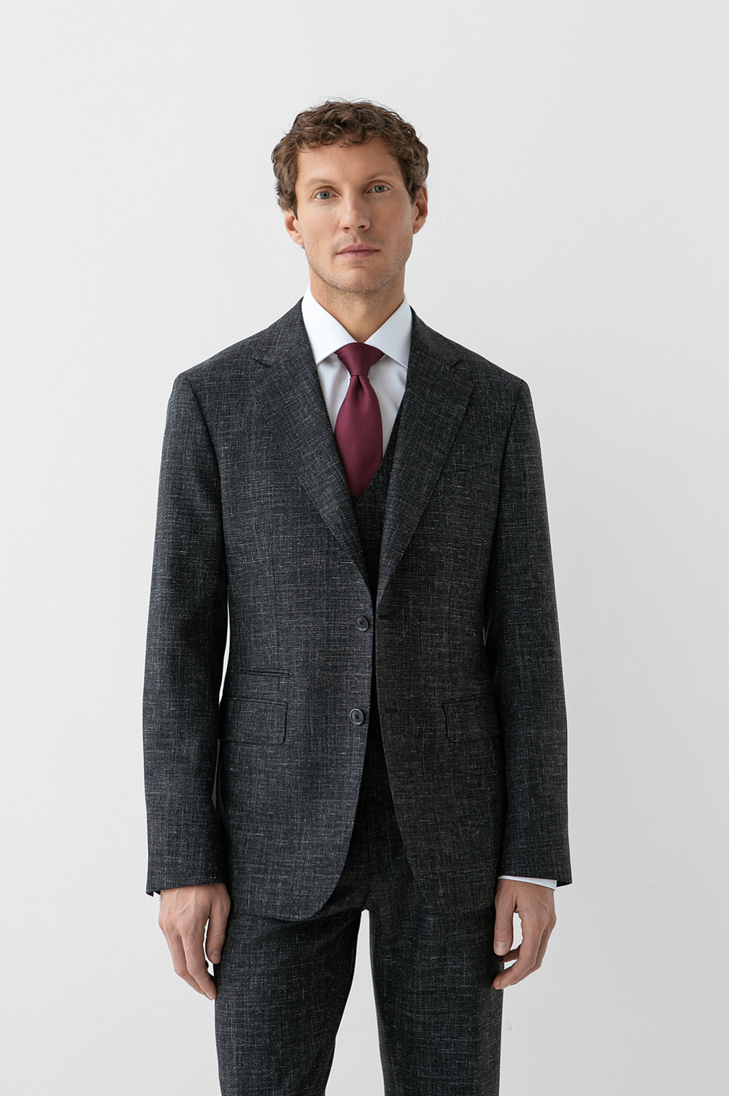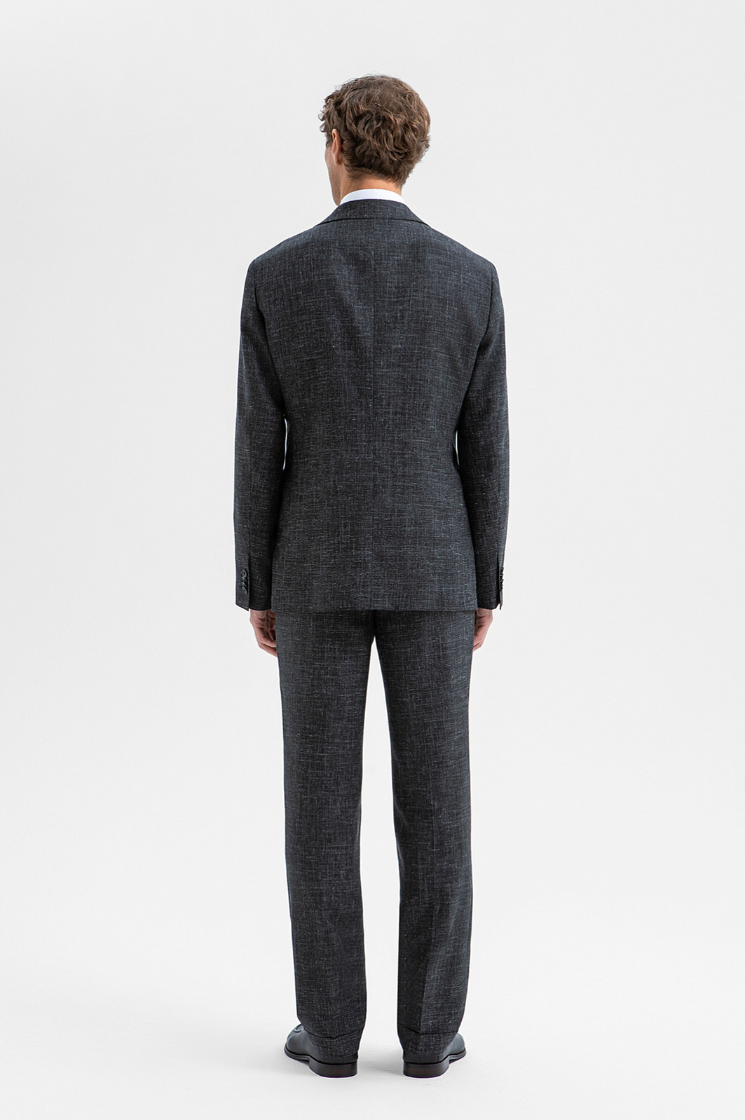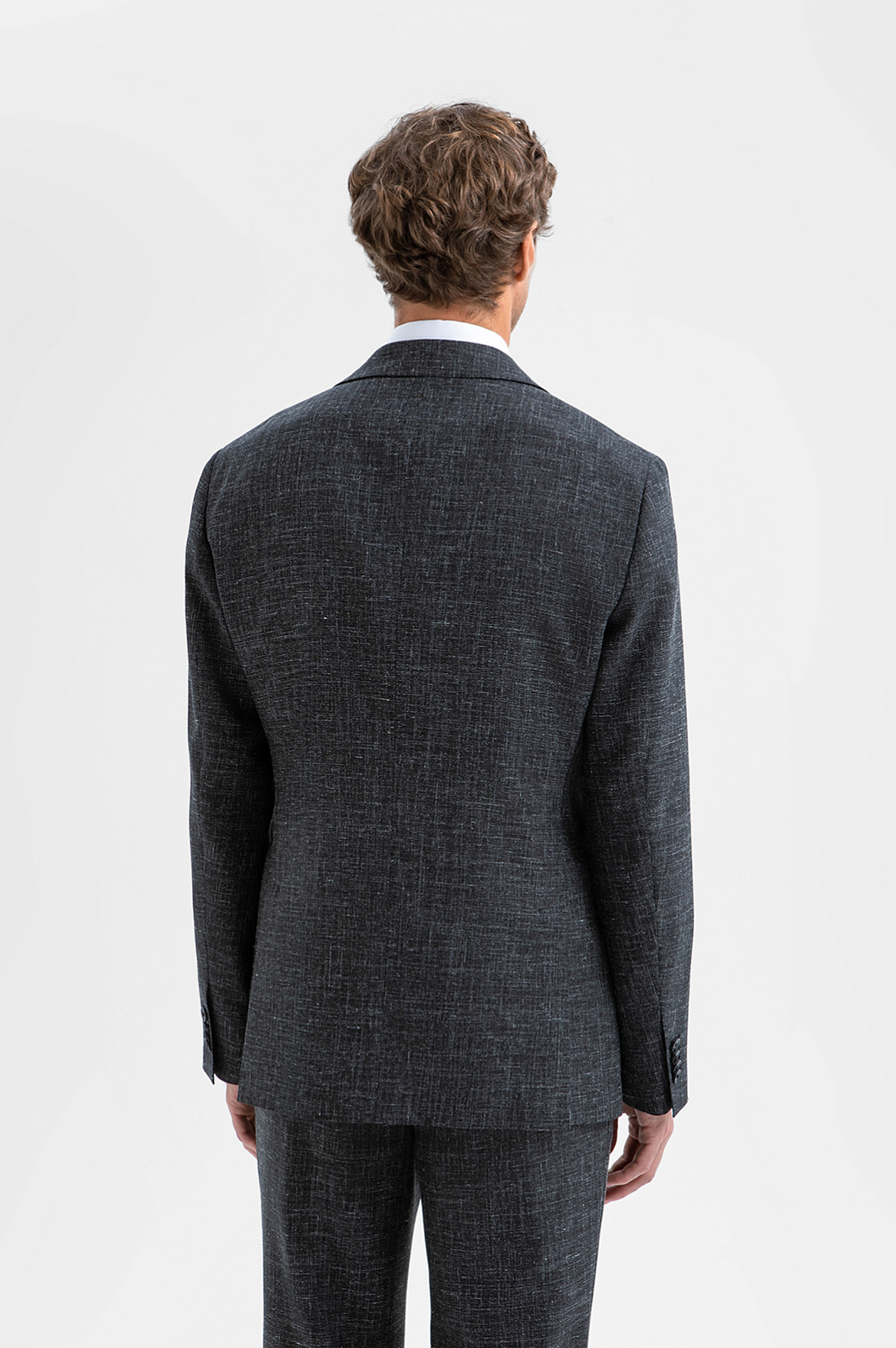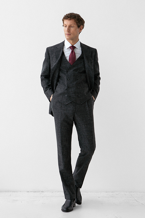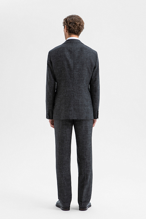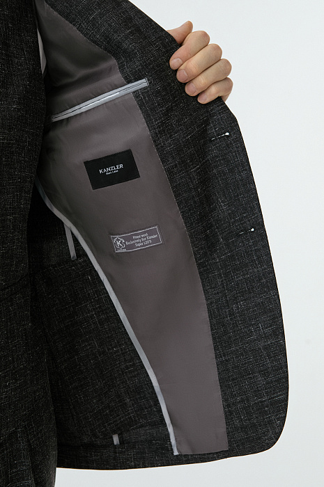 Изысканный чёрный однобортный пиджак KANZLER воплощает гармонию благородного материала и безупречного пошива, создавая образ сдержанной роскоши и утончённой элегантности. Слегка зауженный крой привлекает внимание к мужественному развороту плеч и линии талии. Облегчённая конструкция с частичной подкладкой и мягкое плечо задают максимально естественный силуэт. Премиальная ткань с меланжевым эффектом на основе мягкой шерсти мериноса с добавлением льна и шёлка делает модель всесезонной: в пиджаке не жарко летом и не холодно зимой. Тонкие упругие ворсинки шерсти создают тонкую воздушную прослойку и поддерживают форму, лён и шёлк придают нежность и благородный лоск.
