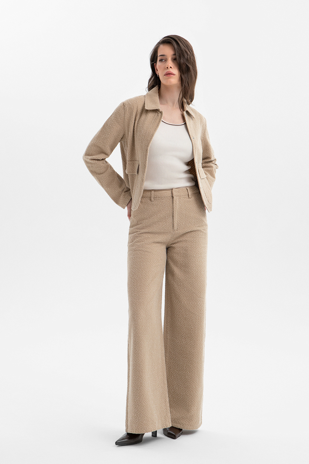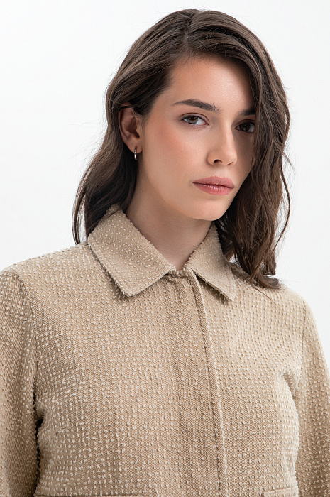Современный пиджак KANZLER тёплого карамельного оттенка задаёт новые стандарты городской элегантности. Он выглядит свежо и гармонично, придавая образу лёгкость и непринуждённый шик. Модель сочетает пиджачный крой с элементами бомбера. Минималистичный дизайн подчёркнут деталями: планкой и накладными карманами с клапанами. Особое внимание привлекает ткань. Белый ворс создаёт выразительный текстурный узор, который придаёт модели особый шарм и приятную тактильность. В составе материала — чистый гипоаллергенный хлопок, который обеспечивает бескомпромиссный комфорт даже в жаркие дни. Саржевое плетение формирует плотную диагональную структуру, благодаря которой ткань хорошо держит форму и сохраняет аккуратный внешний вид.