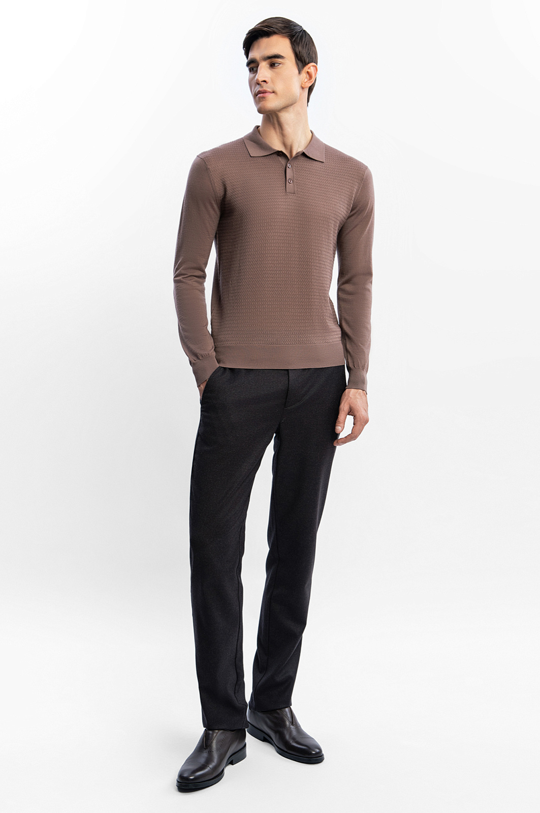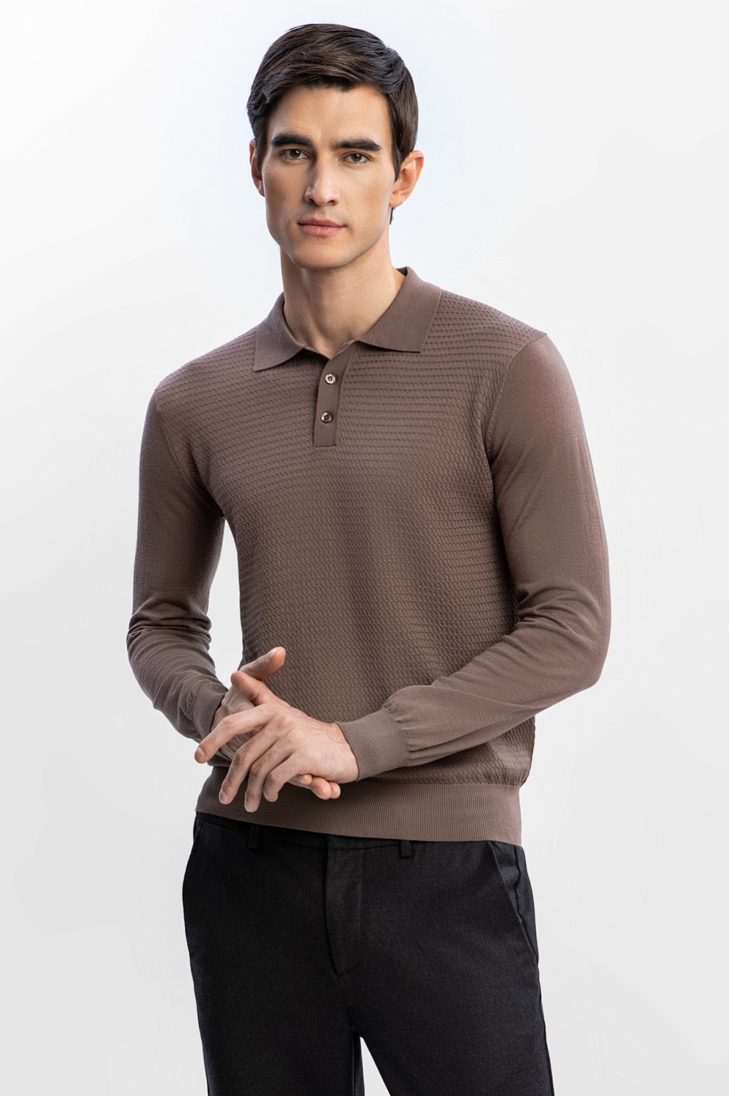 Поло KANZLER из тонкого шерстяного трикотажа оттенка молочного шоколада хорошо сочетается с джинсами в повседневных аутфитах и с пиджаком — в современных деловых образах. Трикотаж мягко облегает тело. Передняя часть украшена приятным слегка фактурным узором. Широкая трикотажная резинка обеспечивает хорошую посадку и надежно держит края. Ткань сделана из 100-процентной шерсти. Тонкие натуральные волокна быстро восстанавливают форму, не мнутся, придают материалу благородный вид и сохраняют тепло тела, защищая от холода и перегревания. Параметры модели: рост 192, 101-76-97 Размер на модели: M