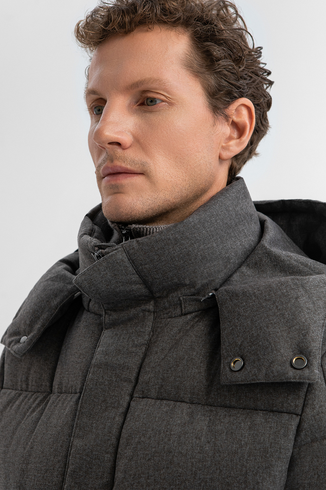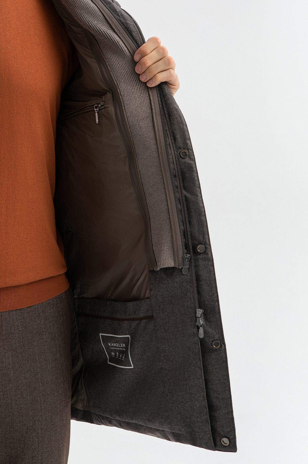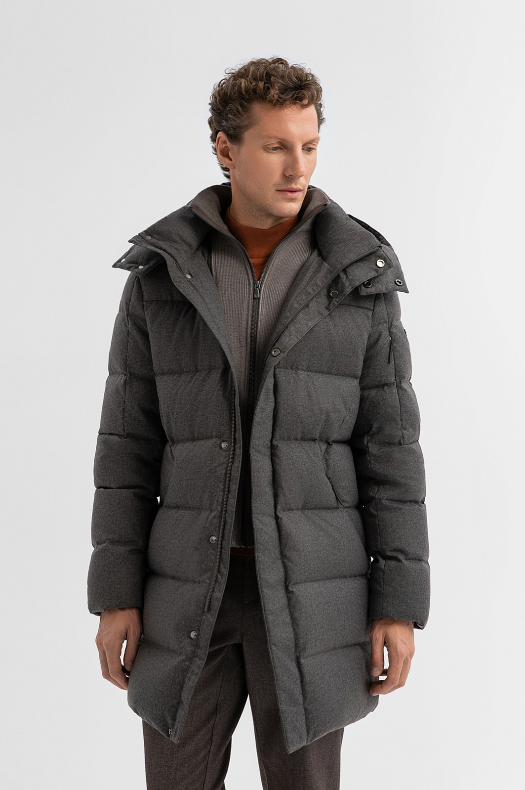 Универсальный коричневый стеганый пуховик KANZLER с трикотажной манишкой и теплым капюшоном — теплая трансформируемая модель для поисков новых впечатлений и неожиданных приключений в городе и на природе. Прямой крой с минималистичными деталями не утяжеляет силуэт, делая его современным и городским. Планка, прикрывающая молнию, высокий воротник и капюшон с застежкой защищают от проникновения внутрь холодного воздуха. Во вместительных боковых карманах на молнии можно согреть руки. Внешний слой выполнен из эстетичного матового полиэстера, тактильно схожего с шерстяной тканью. Водоотталкивающая обработка не позволяет влаге проникать в ткань, обеспечивая надежную защиту от дождя и снега. Внутри — натуральный наполнитель из пуха с пером, который согреет и в холода, и в морозы. Параметры модели: рост 188, 97-82-92 Размер на модели: 50