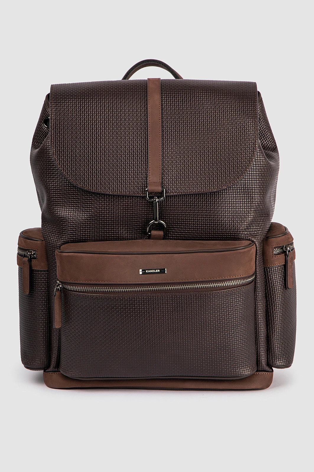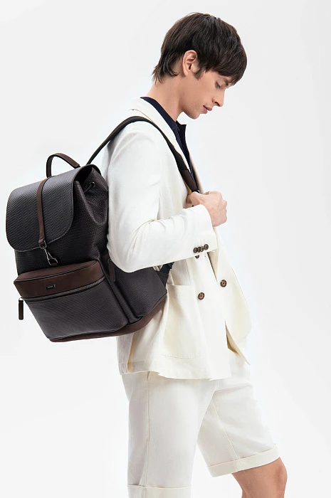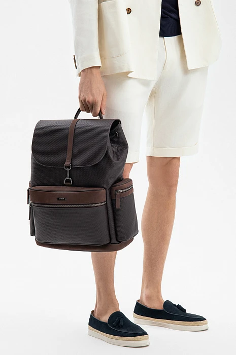 Роскошный рюкзак KANZLER из кожи и замши — продуманный до мелочей стильный и функциональный аксессуар, в котором можно расположить все необходимое для работы или поездки. Качественная натуральная кожа с тиснением и замшевые детали и вставки придают рюкзаку выразительную текстуру и премиальный вид. Вместительное основное отделение можно стянуть шнурком, продетым в люверсы, и закрыть сверху клапаном, который фиксируется карабином. Мелочи, которые должны быть в доступе, легко разместить в трех внешних карманах на молнии. С помощью ручки и широких регулируемых лямок рюкзак можно носить в руке или на спине.