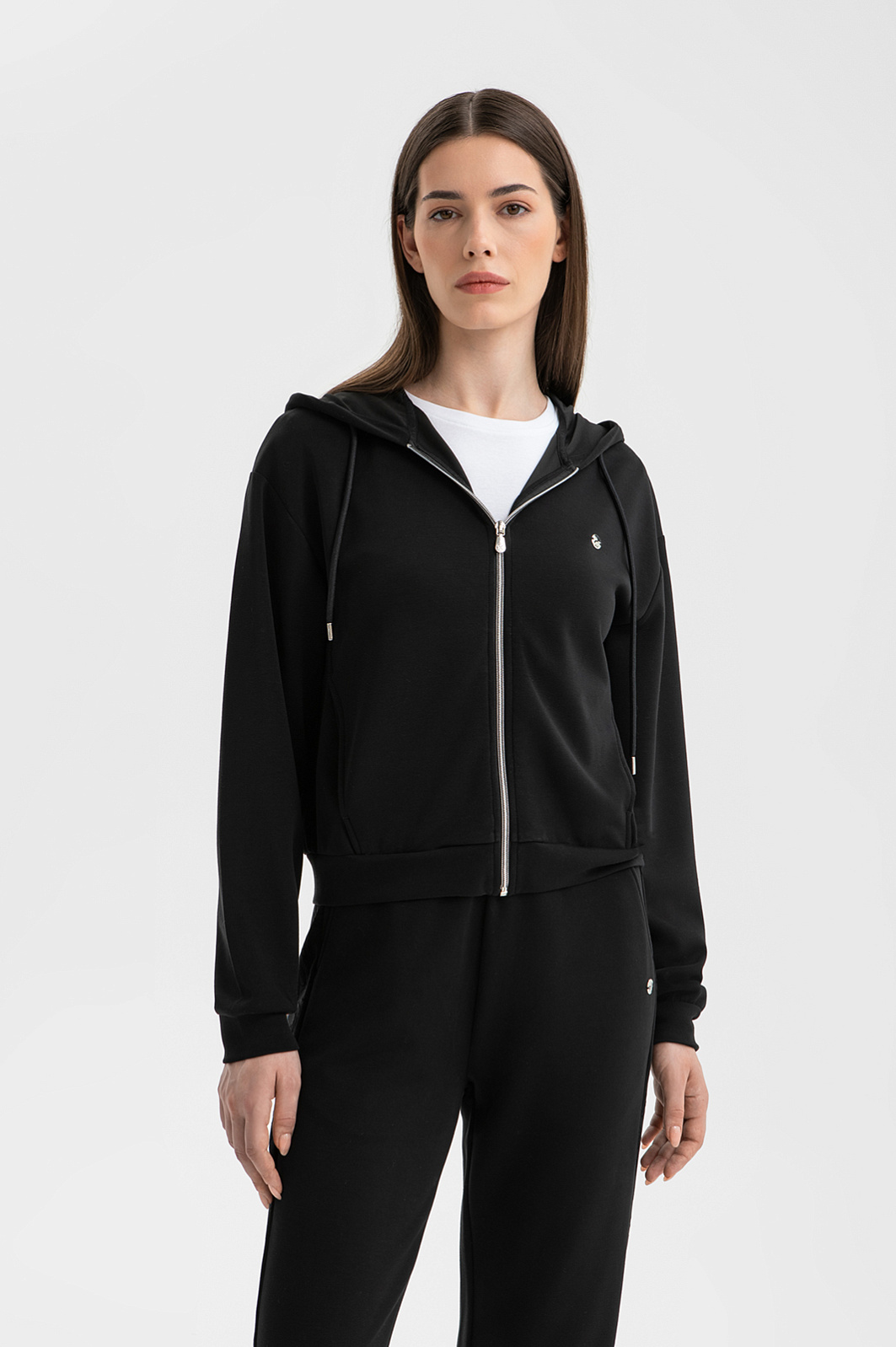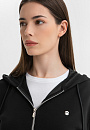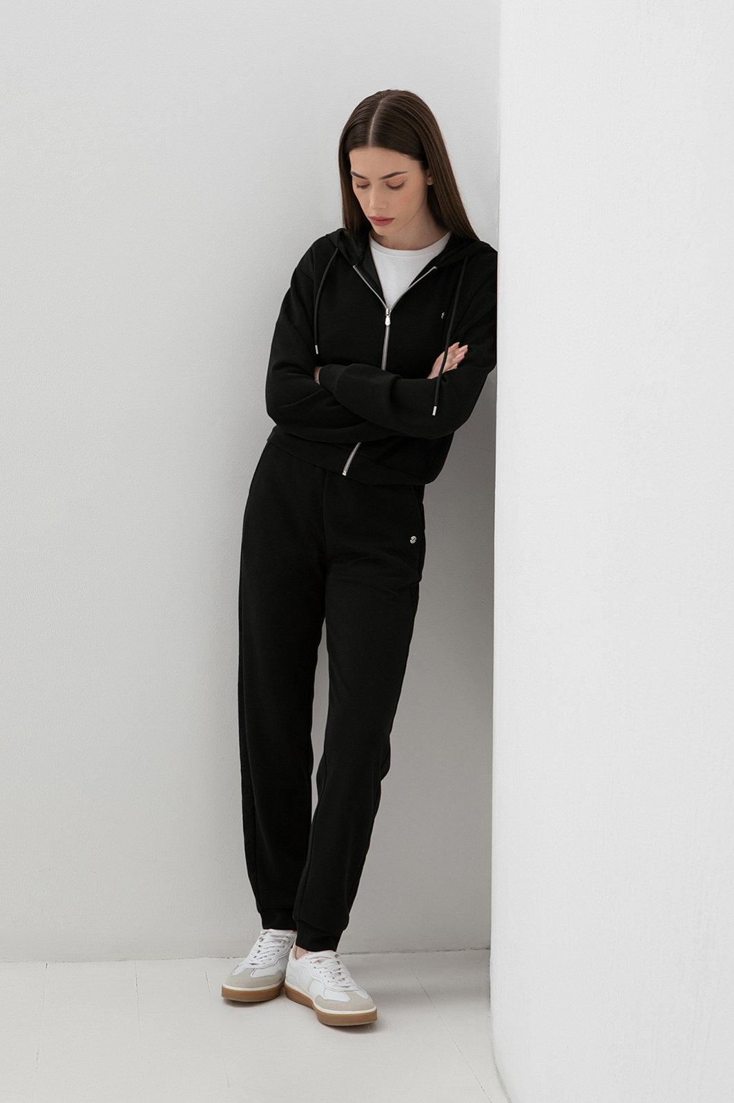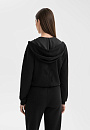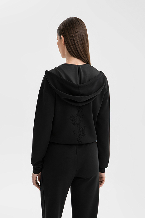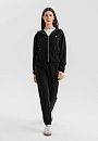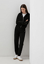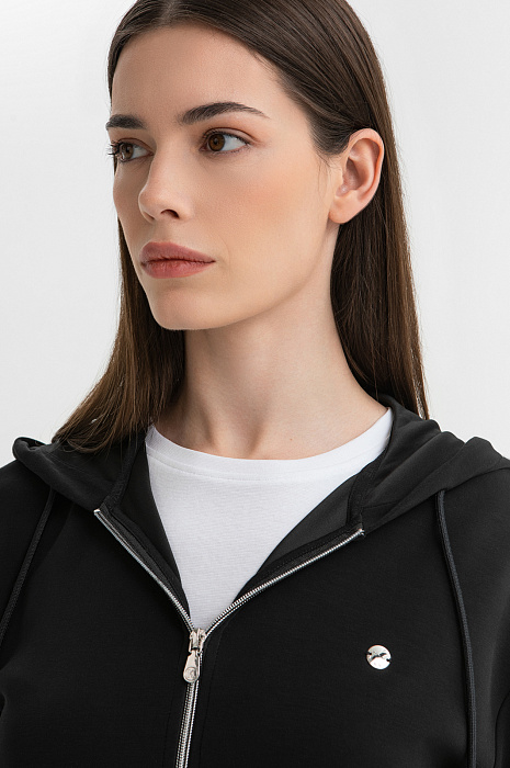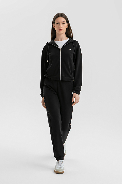 Чёрный спортивный костюм KANZLER — идеальный аутфит для утренней чашки капучино на террасе, похода в спа или прогулки по городу. Толстовку на молнии и брюки на кулиске можно носить вместе и по отдельности, легко адаптируя к настроению. Изысканные детали — объемный мягкий капюшон, трикотажные манжеты на щиколотках и лампасы с тонкой цветочной графикой — придают образу утончённость и женственность. Акценты — застёжка-молния и наконечники на шнурках — добавляют шика. Современная инновационная ткань — практичное сочетание модала, полиэстера и спандекса. Она пропускает воздух, устойчива к износу и хорошо тянется, не ограничивая движений.