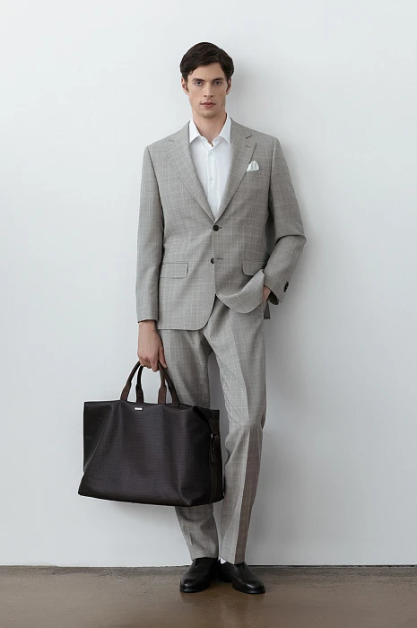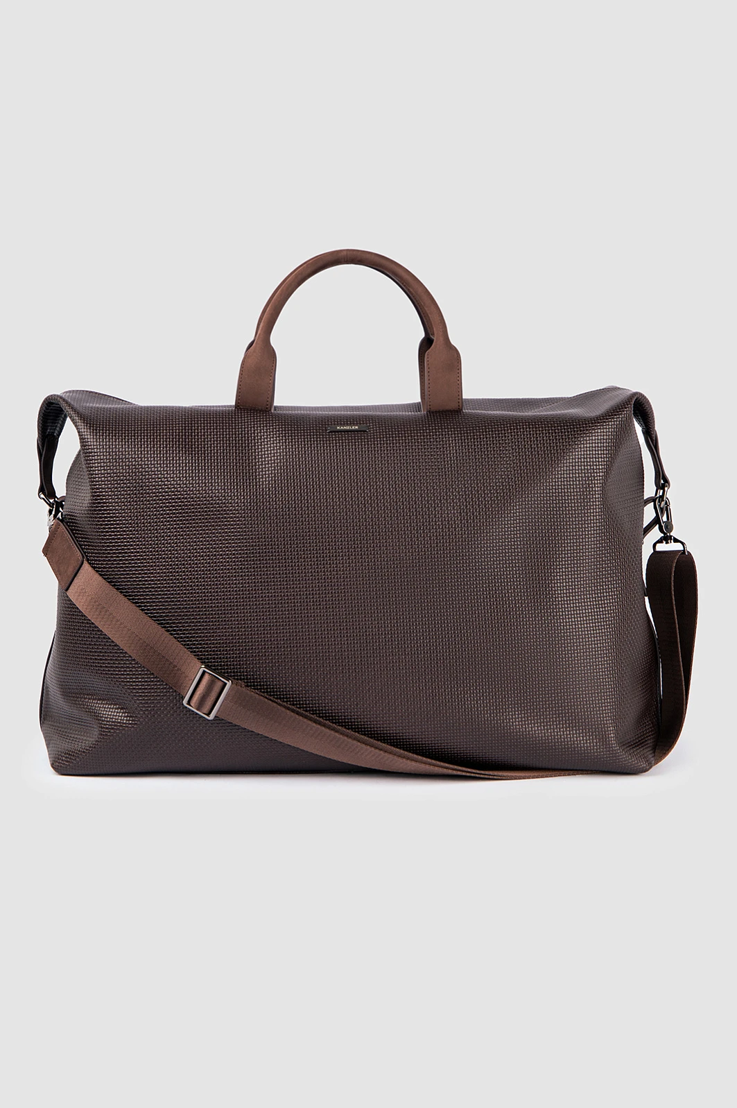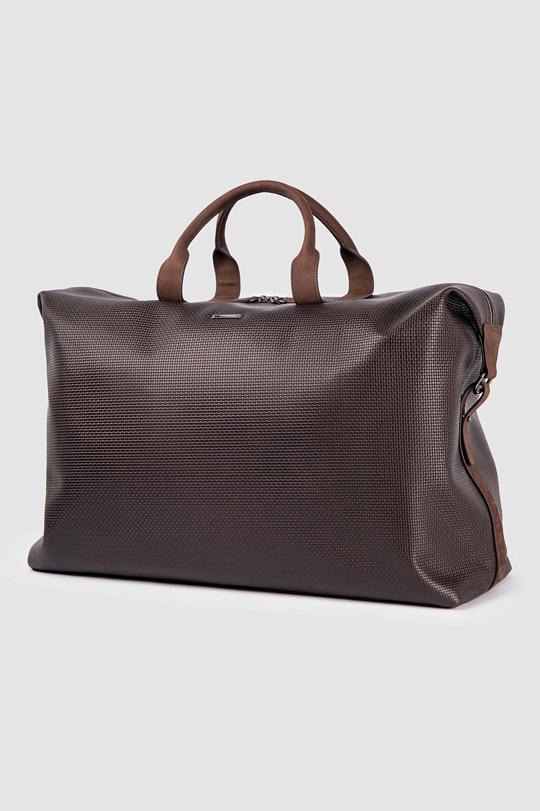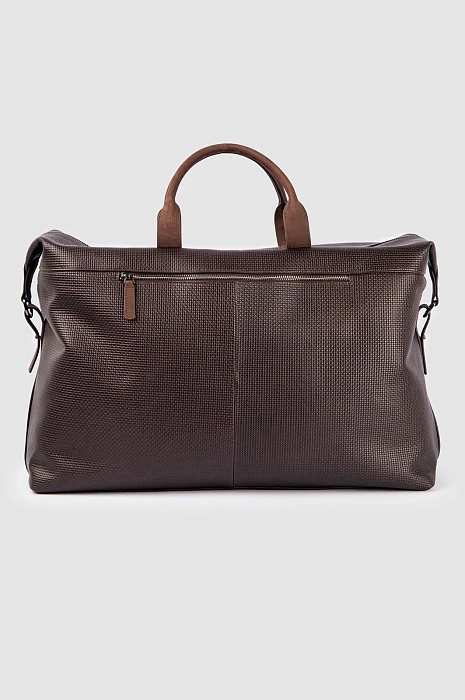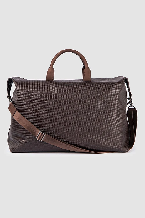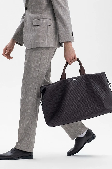 Роскошная дорожная сумка KANZLER из темно-коричневой тисненой кожи и замши с карманом на молнии — идеальный спутник для коротких деловых поездок, путешествий и уикендов за городом. Это функциональный, практичный и стильный аксессуар. Качественная натуральная кожа с тиснением и замшевые детали придают сумке выразительность и делают ее заметной и премиальной вещью. В сумке можно комфортно разместить всё необходимое: одежду, обувь, документы, ноутбук и предметы личной гигиены. Удобные ручки и съемный регулируемый ремень позволяют носить дорожную сумку в руке и на плече.