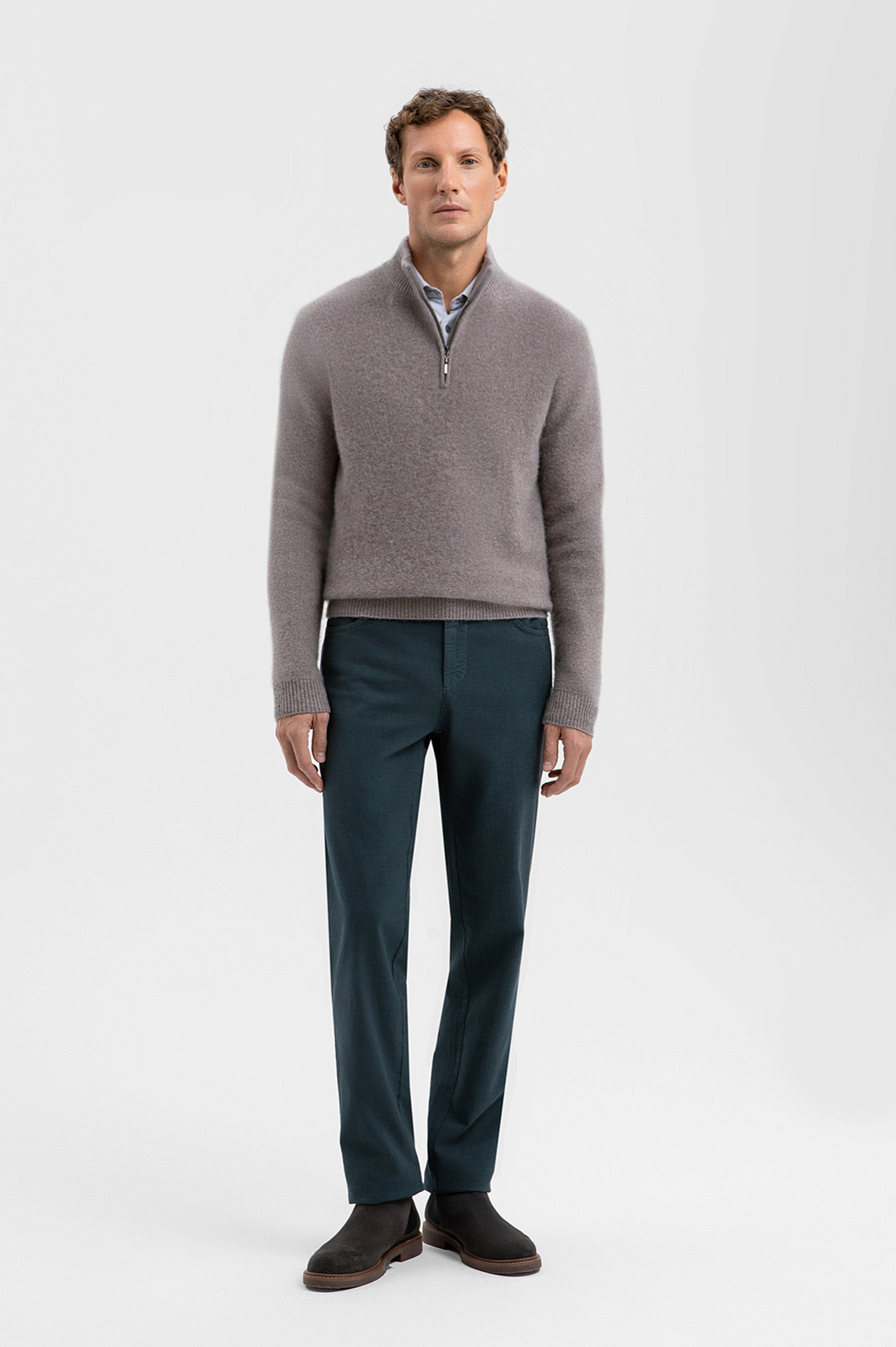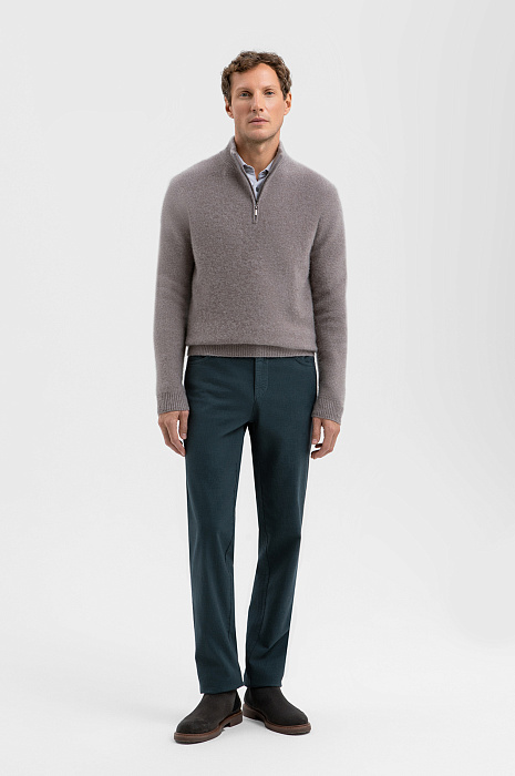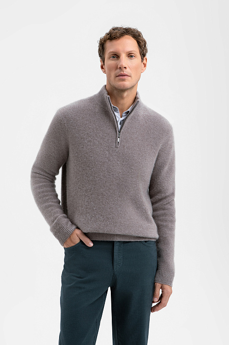 Стильный свитер KANZLER с высоким горлом на молнии из чистого кашемира в тёплом серо-коричневом оттенке — не просто одежда. Это роскошная вещь из лимитированной коллекции, которая придаёт уверенности и помогает обрести дзен в ежедневной рутине. Высокий воротник на молнии создаёт строгий лаконичный силуэт, а в расстёгнутом виде придаёт расслабленной небрежности. Трикотажные резинки мягко поддерживают края, обеспечивая аккуратную посадку. Гладкая вязка служит фоном, который раскрывает красоту и благородство дорогого натурального материала. Кашемир — секрет непревзойдённого комфорта, который хочется всегда носить при себе. Его невесомые волокна нежно обнимают тело, сохраняя естественное тепло. Параметры модели: рост 188, 97-82-92 Размер на модели: M