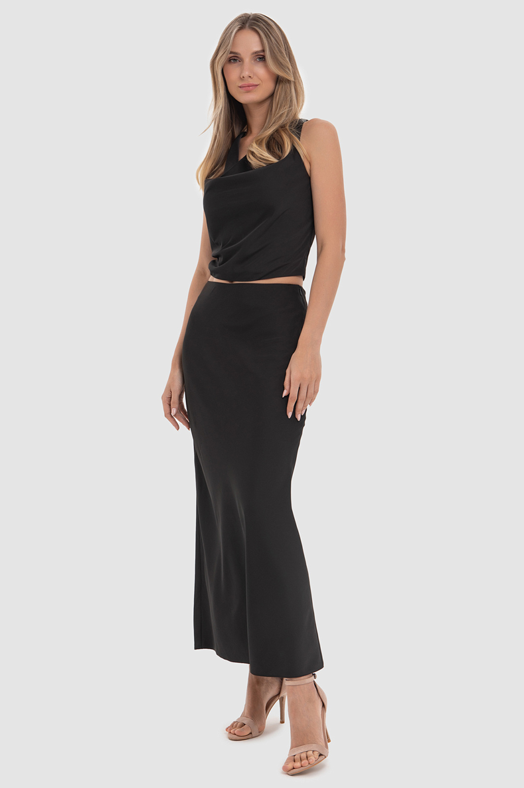 Сдержанный черный цвет топа поставил акцент на его дизайне: асимметричный силуэт и драпированный вырез выгодно подчеркивают зону декольте, добавляя нотку изысканности. Дизайнеры выбрали гладкий синтетический материал с деликатным блеском, который комфортно облегает фигуру, создавая женственный силуэт. Топ застегивается на молнию, что обеспечивает удобство и практичность. Широкие бретели добавляют модели особого шарма, делая ее подходящей для различных случаев. Несмотря на отсутствие ярких деталей, черный топ KANZLER легко впишется в коктейльный наряд в комплекте с юбкой в длине миди - идеально для вечернего мероприятия, светской встречи или вечеринки. Элегантность и современный стиль в каждом элементе. Параметры модели: рост 180, 87-61-91 Размер на модели: S