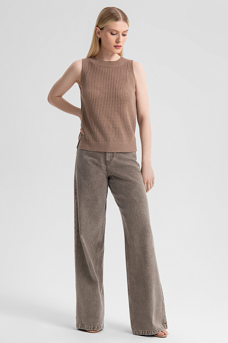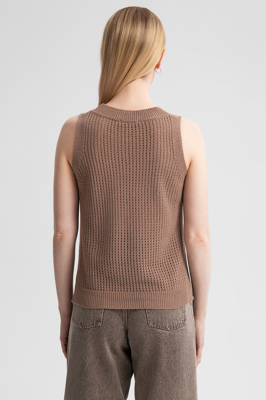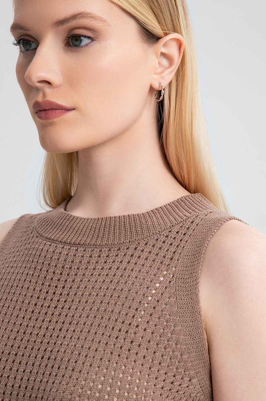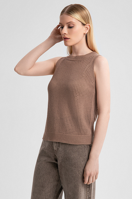 Топ KANZLER изо льна и хлопка в трендовом оттенке мокко — ключ к расслабленному и утонченному образу. Для создания модели дизайнеры выбрали природный материал, сочетающий в себе лучшие качества двух видов натуральных волокон: прочный лен дарит коже ощущение прохлады в жаркий день, а гипоаллергенный хлопок обеспечивает мягкость и воздухопроницаемость. Тонкое ажурное плетение привносит в образ глубину и фактуру. Мягкая резинка на вороте, проймах и подоле обеспечивает аккуратную посадку по фигуре. Теплый нейтральный цвет делает этот топ универсальным дополнением к гардеробу, легко сочетающимся с брюками, джинсами или юбками в коричневых или молочных оттенках. Параметры модели: рост 175, 88-65-92 Размер на модели: S