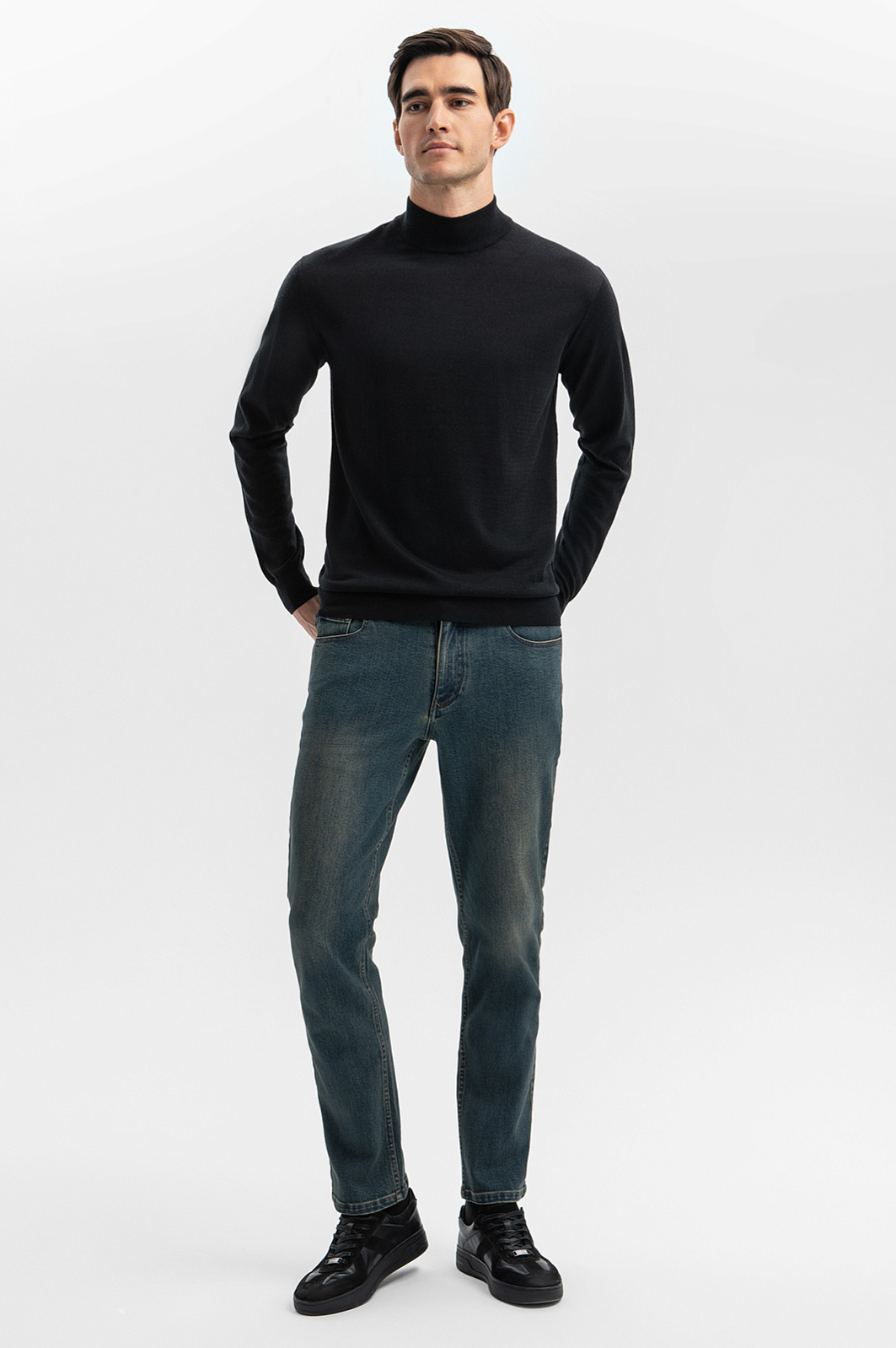 Черная полуприталенная водолазка KANZLER - базовый элемент мужского гардероба. Ее можно носить в качестве самостоятельного изделия или в актуальных многослойных комплектах. Изделие с воротом комфортной высоты будет уместно и в офисе со строгим костюмом, и на прогулке с неформальными джинсами. Лаконичную модель дизайнеры выполнили из легкого трикотажа на основе нежной согревающей шерсти, которая поддерживает комфортную температуру как в помещении, так и на улице. Благодаря своим гипоаллергенным свойствам, водолазка станет вашим надёжным спутником, сочетая стиль и функциональность. Параметры модели: рост 192, 101-76-97 Размер на модели: M